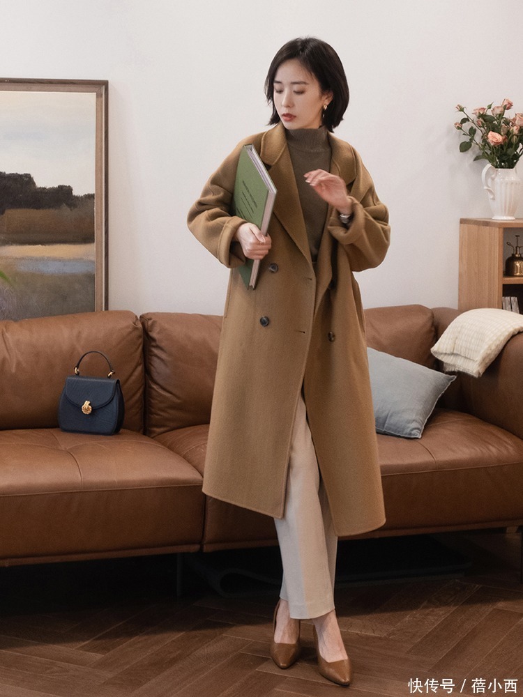驼色大衣内搭深咖色毛衣,这2件单品齐是属于地面色系。